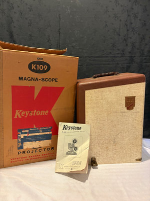 Keystone K-109 Magna-Scope 8mm projector with original case and box. Power cable is old . Extra lens and manual.