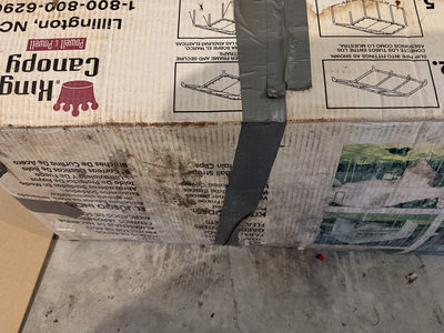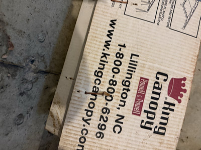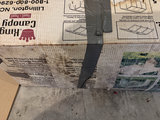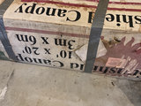 A large cardboard shipping box with KingCamp branding and assembly diagrams, secured with grey straps, containing 10x20 canopy