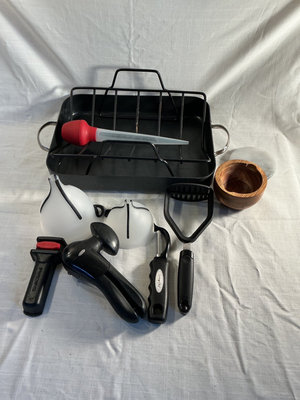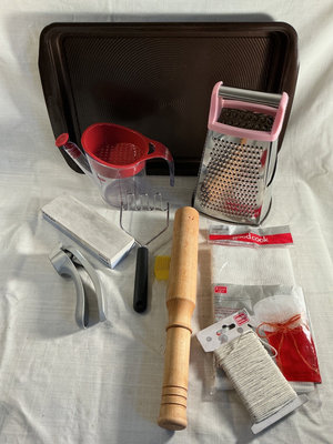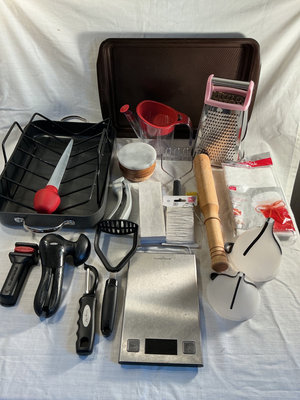 Roasting pan, sheet pan, box grater, fat skimmer, funnels, mashers, wood salt container with marble top, digital scale tested, and all you see here.