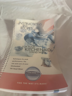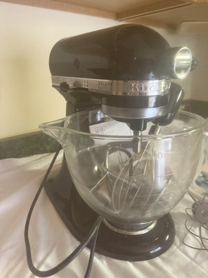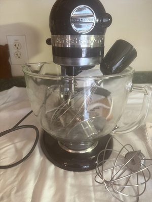 Black KitchenAid Deluxe Edition stand mixer with a glass mixing bowl and metal attachments including a wire whisk, dough hook, and beater, along with an instruction manual.