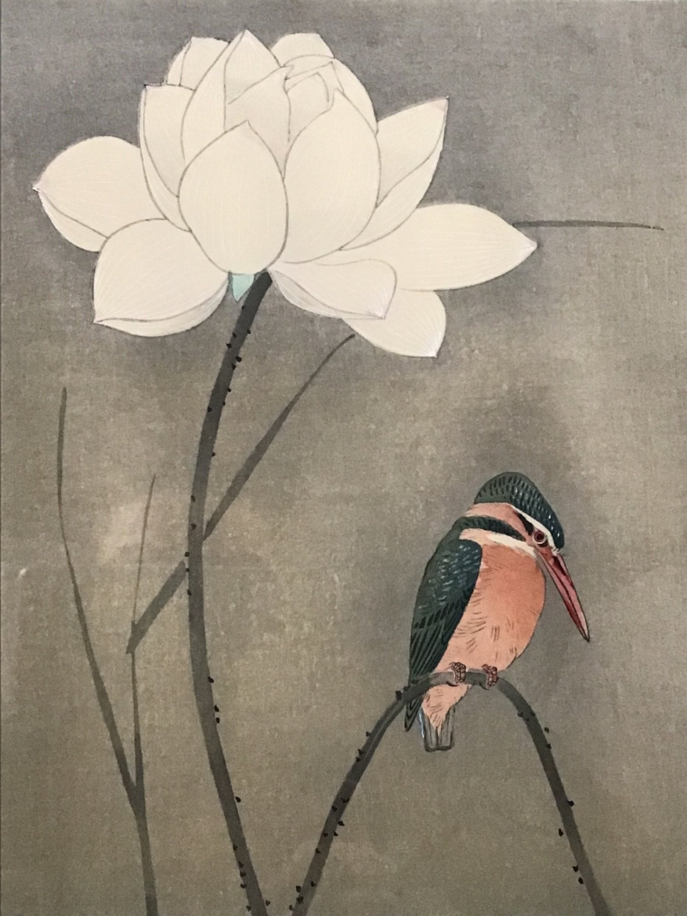 Ohara Koson (Japanese, 1877-1945) "Kingfisher with Lotus Flower" print mounted on 3D mat. Art 16x10, frame 25.25x19. 1 piece.