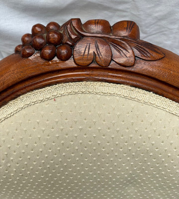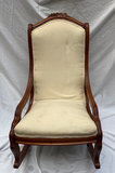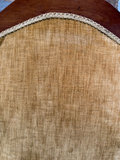 Has original gold velvet upholstery on the back . Front was redone , some stains . Comfortable and a great nursing chair with low arms.