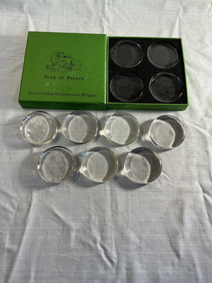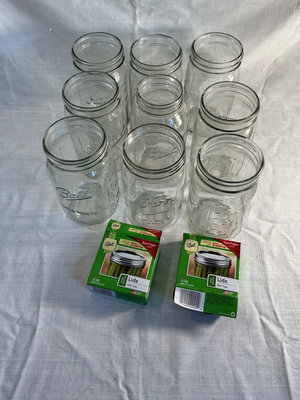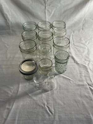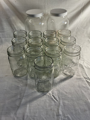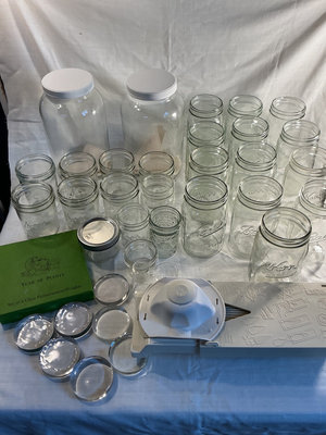 A collection of glass mason jars in various sizes with metal lids and bands, glass fermentation weights, several loose lids and rings, small glass jars, and a Borner slicer with multiple interchangeable inserts.
