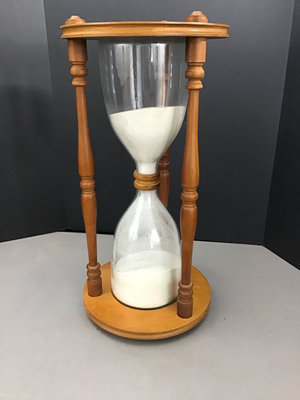 Like sands through the hour glass… so are the days of our lives. Unusually large glass and wood hour glass. Sand is a bit clumpy and only filters about half way, might be an obstruction somewhere. 22h x 11.5d. 1 piece.