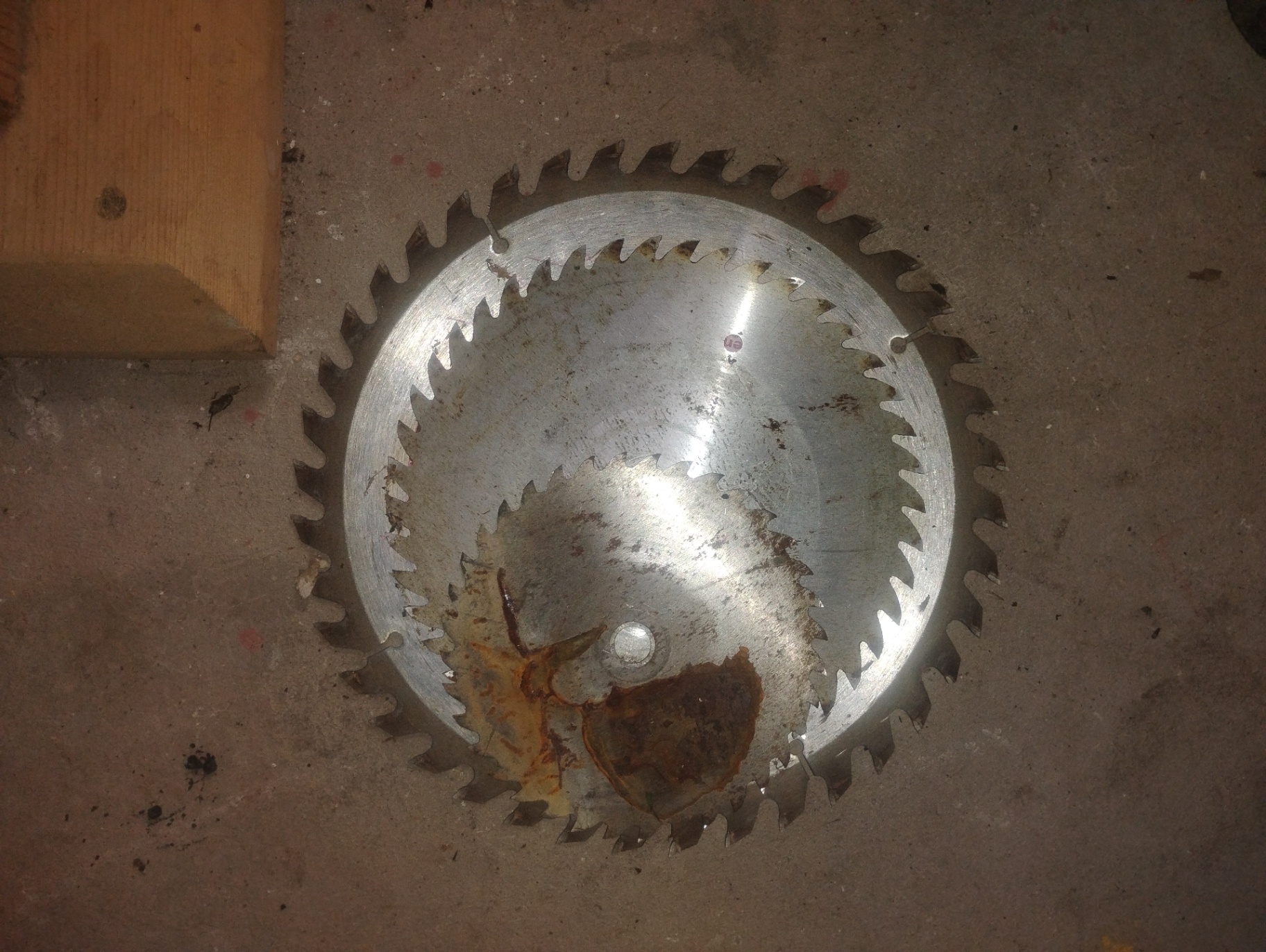 A large metal circular saw blade with outer serrated edge and a smaller inner toothed ring.