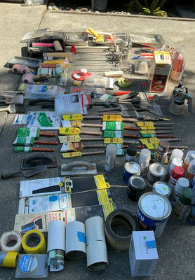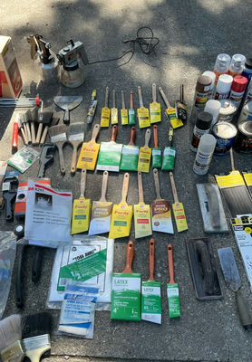 Brushes, rollers drywall supplies three sprayers untested etc comes with two large tubs which are holding all of these items we so carefully laid out on the driveway to shoot for YOU!