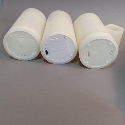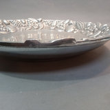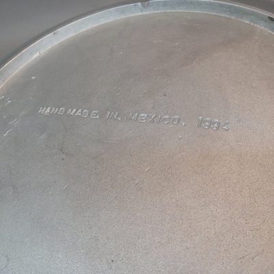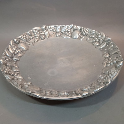Large pewter charger/decorative plate, handmade in Mexico, 18.5d x 3h. Battery operated candles of various sizes, all need new batteries, 2h to 6h. 9 pieces.