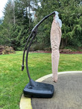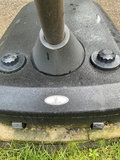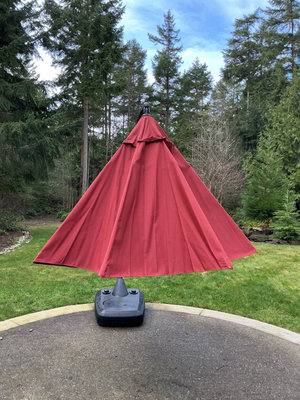 A red cantilever outdoor patio umbrella with a curved black frame, beige protective sleeve covering the canopy, and a wheeled, heavy black umbrella base. Umbrella is at least 10 feet across and in excellent shape.