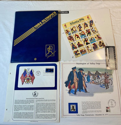 A diverse collection of postage stamps, first day covers, souvenir sheets, and commemorative envelopes from the United States and various international issues, including an Olympic commemorative folder and related material.