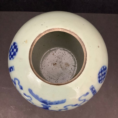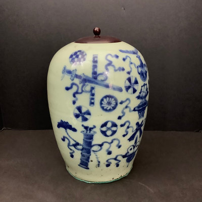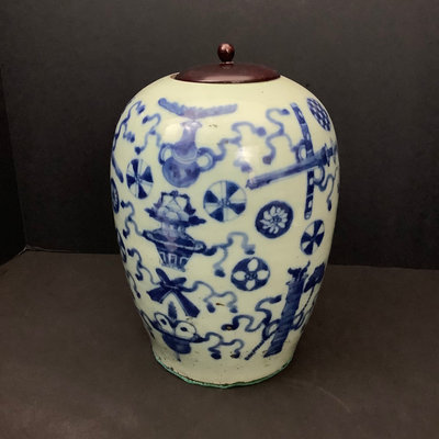 Large hand thrown ginger jar, wooden fitted lid, glaze over terracotta, crack on bottom, no stamps, 9dx12h. 1 piece.