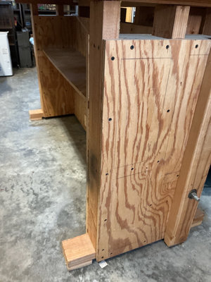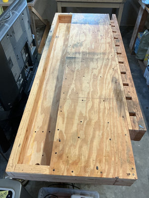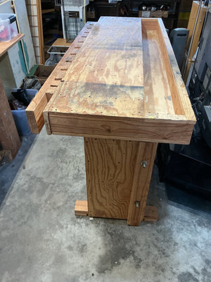 A heavy-duty wooden workbench with a long plywood work surface featuring multiple drilled holes and a row of rectangular slots along the edge, supported by a sturdy base and side panel with an internal shelf. 72" x 28" x 40" high.