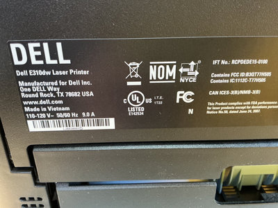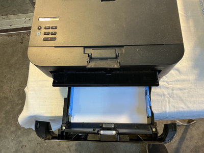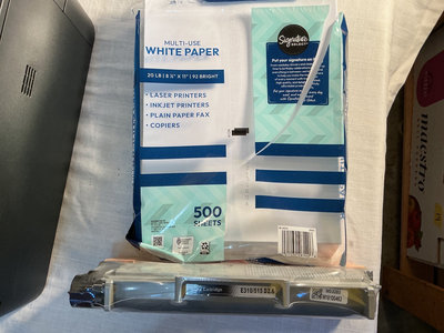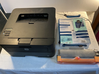 A Dell E310dw laser printer with toner cartridge and some multi-use white paper.