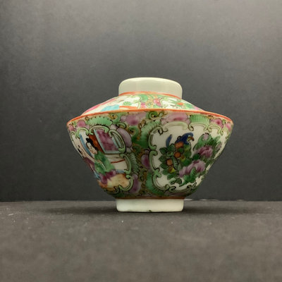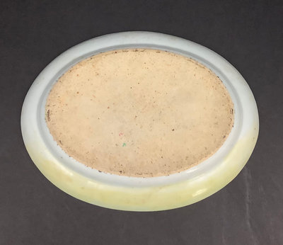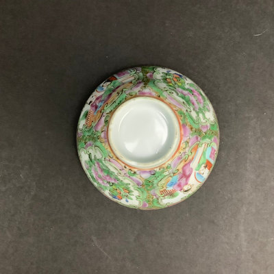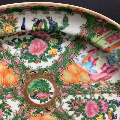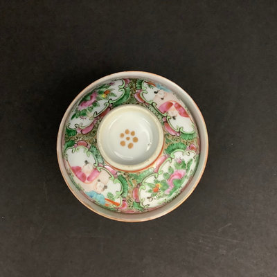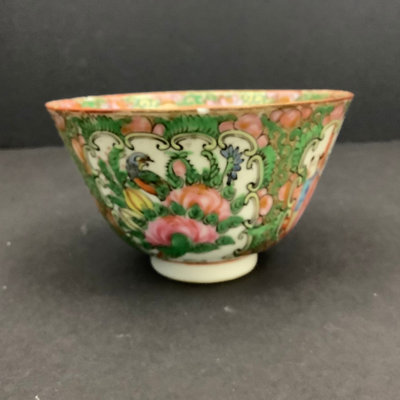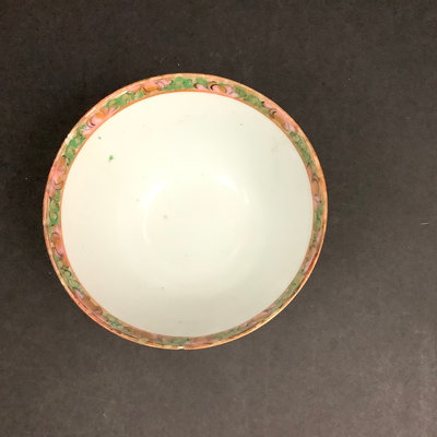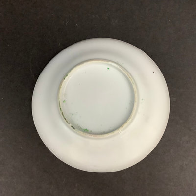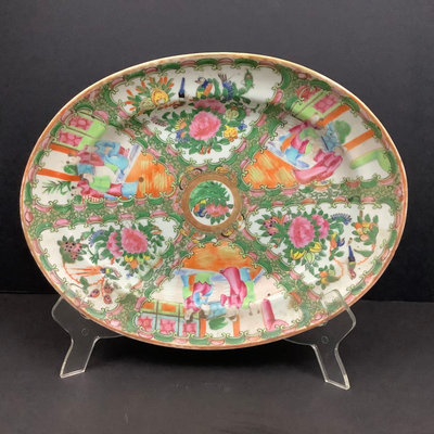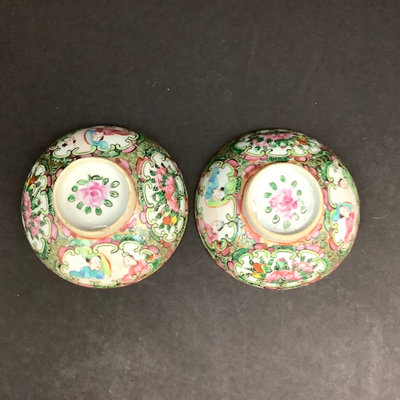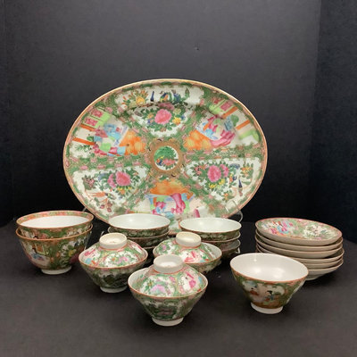 Small platter 13.5d. Pair of cups, one with small chips on rim and small crack seen from the inside, 4.25dx3h. Teacups and lids (4/3 missing a lid), 3.75d x 2h. Low bowls, 3.75d x 1.5h, tiny chips or paint thinning on rims. Saucers 5d. No marks on bottom. 22 pieces.