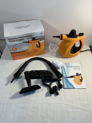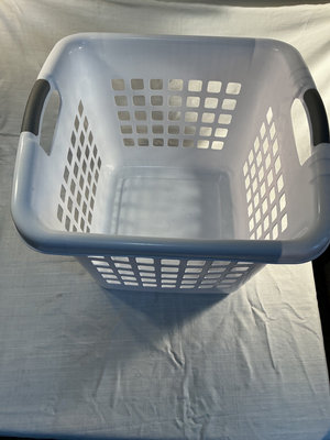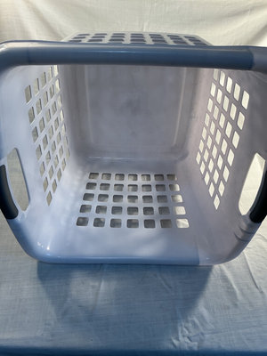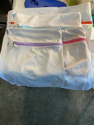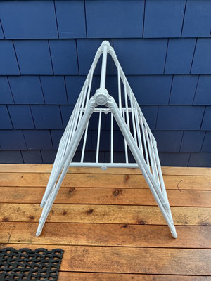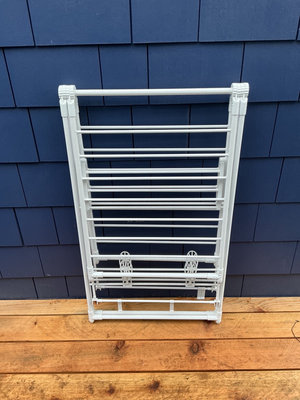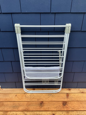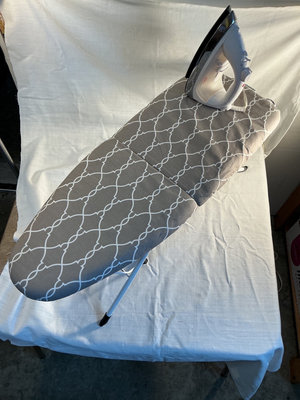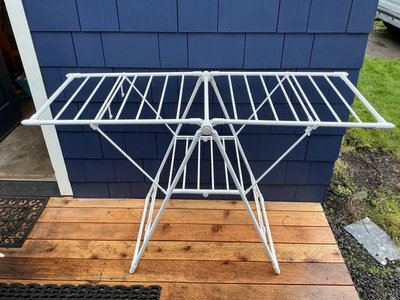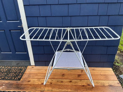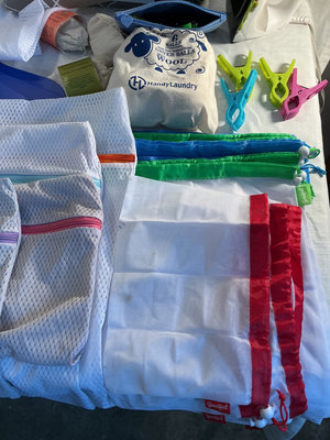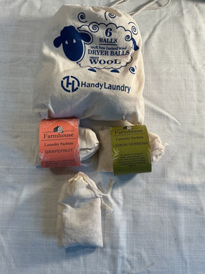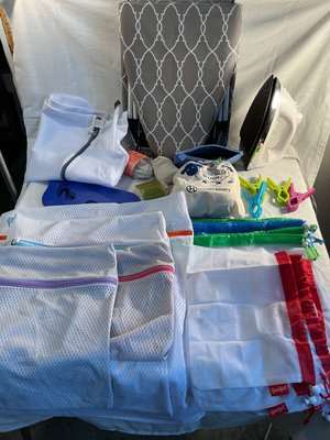 A collection of laundry-related items including two white metal clothes drying racks, a folded drying frame, two plastic laundry baskets, an ironing board with a gray patterned cover, an iron, mesh delicates pouches, sachets of Farmhouse laundry fragrances (grapefruit and lemon verbena), a bag of dryer balls, and assorted laundry accessories. Handheld steam cleaner, tested.