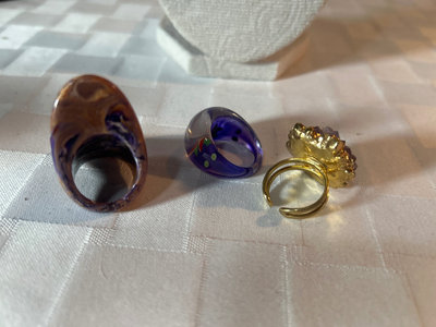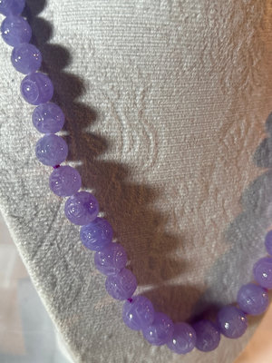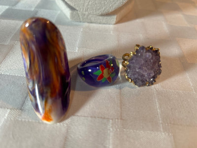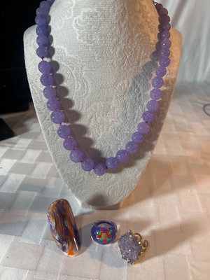 The carved lavender jade necklace is 18” long. Two of the rings are plastic and the other does feature an amethyst cluster.
