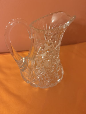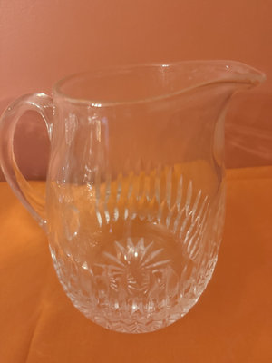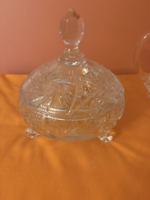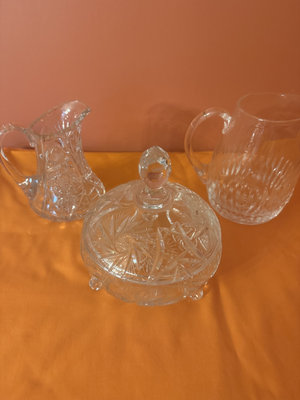 A three-piece lead crystal glassware set consisting of a lidded sugar bowl and two matching creamer pitchers, all featuring a faceted, decorative pattern.