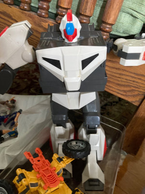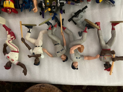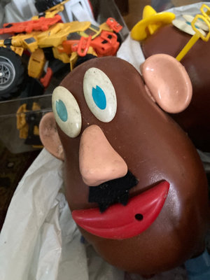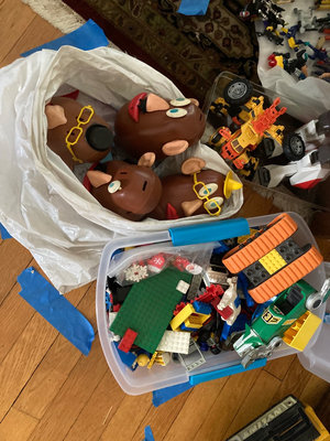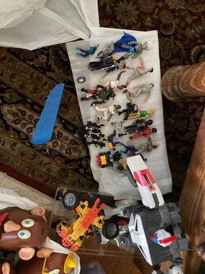 A mixed collection of toys including Mr. Potato Head heads, a large white/gray transforming robot figure, assorted LEGO bricks with a green baseplate, and numerous small action figures. Not checked for completeness.