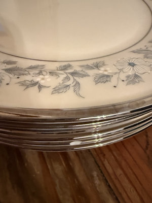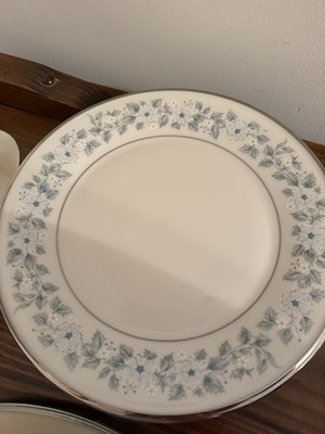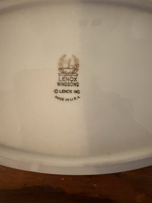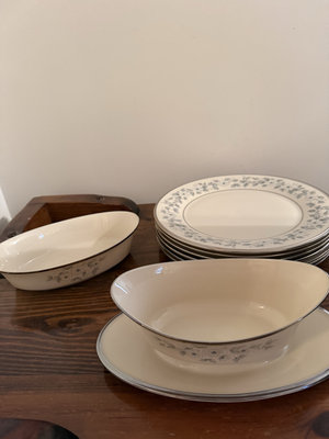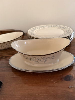 Ivory Lenox Windsor dinnerware collection including plates, bowls, and a serving dish, all featuring a blue floral border and stamped Lenox Windsor Made in USA. 6 dinner plates, gravy boat and small serving bowl