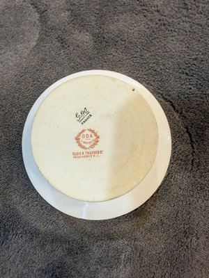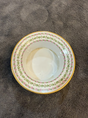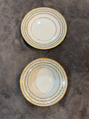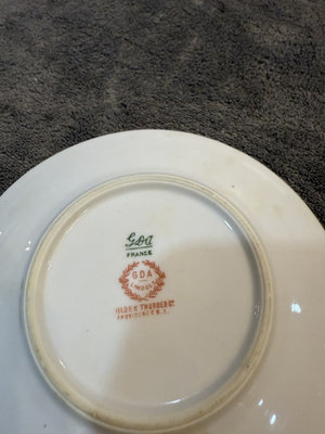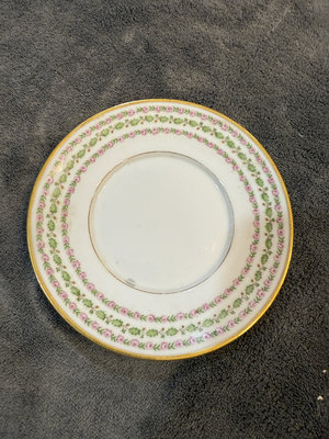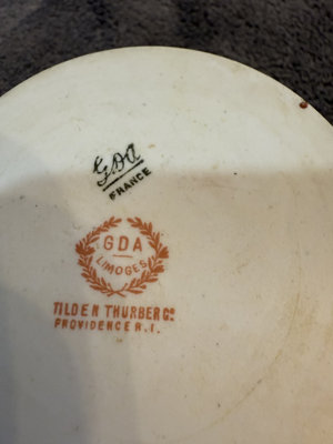 Two-piece porcelain teacup and saucer set featuring a pink rose and green leaf garland with gold trim. Cup diameter about 4 inches and saucer about 5 inches; bottom marks include GDA LIMOGES, FRANCE and TILDEN THURBER CO PROVIDENCE R.I.