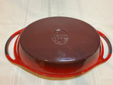 Cast iron cookware including a Dutch oven an enamel-coated oval dish with a red rim and red handles. Both by Lodge