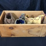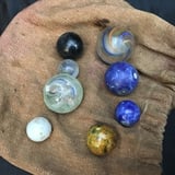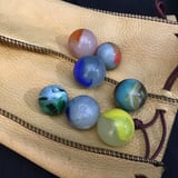 Antique and vintage glass and clay marbles contained in cloth and leather bags, some marbles are pitted or chipped from many hours of youthful gametime. Includes handmade wood box, 15x8x5.5. 100 plus pieces.