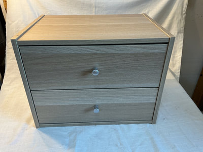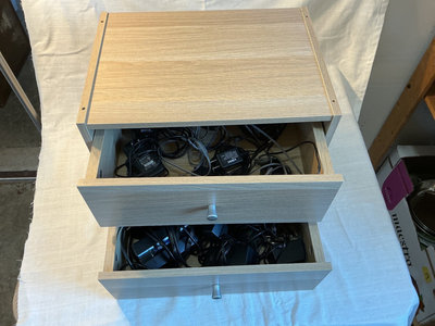 Small, light wood veneer cabinet with two front drawers (16” wide, 12” depth, 12” height). The drawers contain an assortment of various electronic adapters and cables. Perfect for an electrician who is always repairing something.