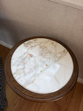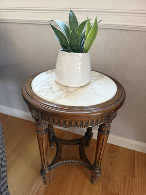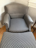 A grey patterned upholstered armchair with a matching ottoman, a round marble-top wooden side table 15”and a faux potted plant in a white ceramic pot.