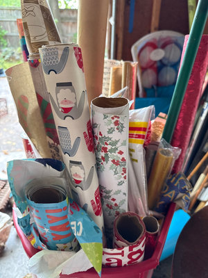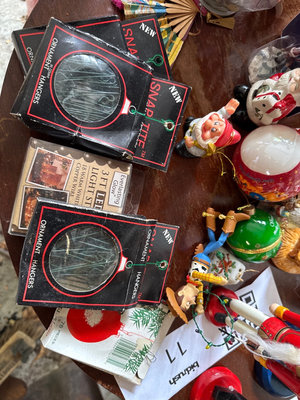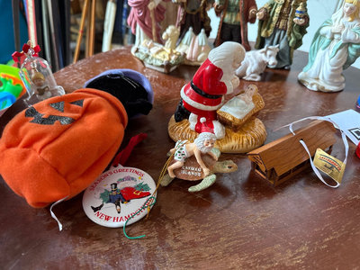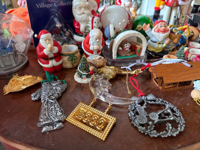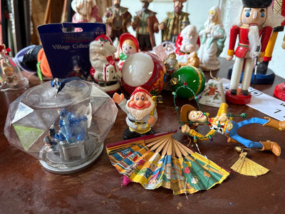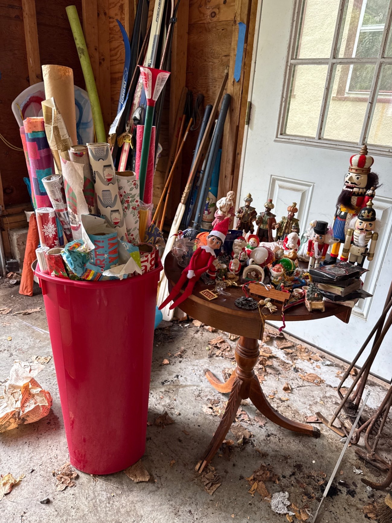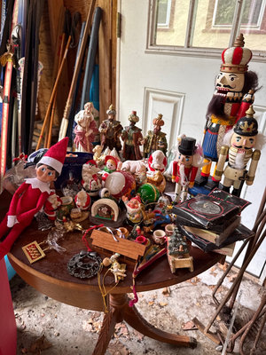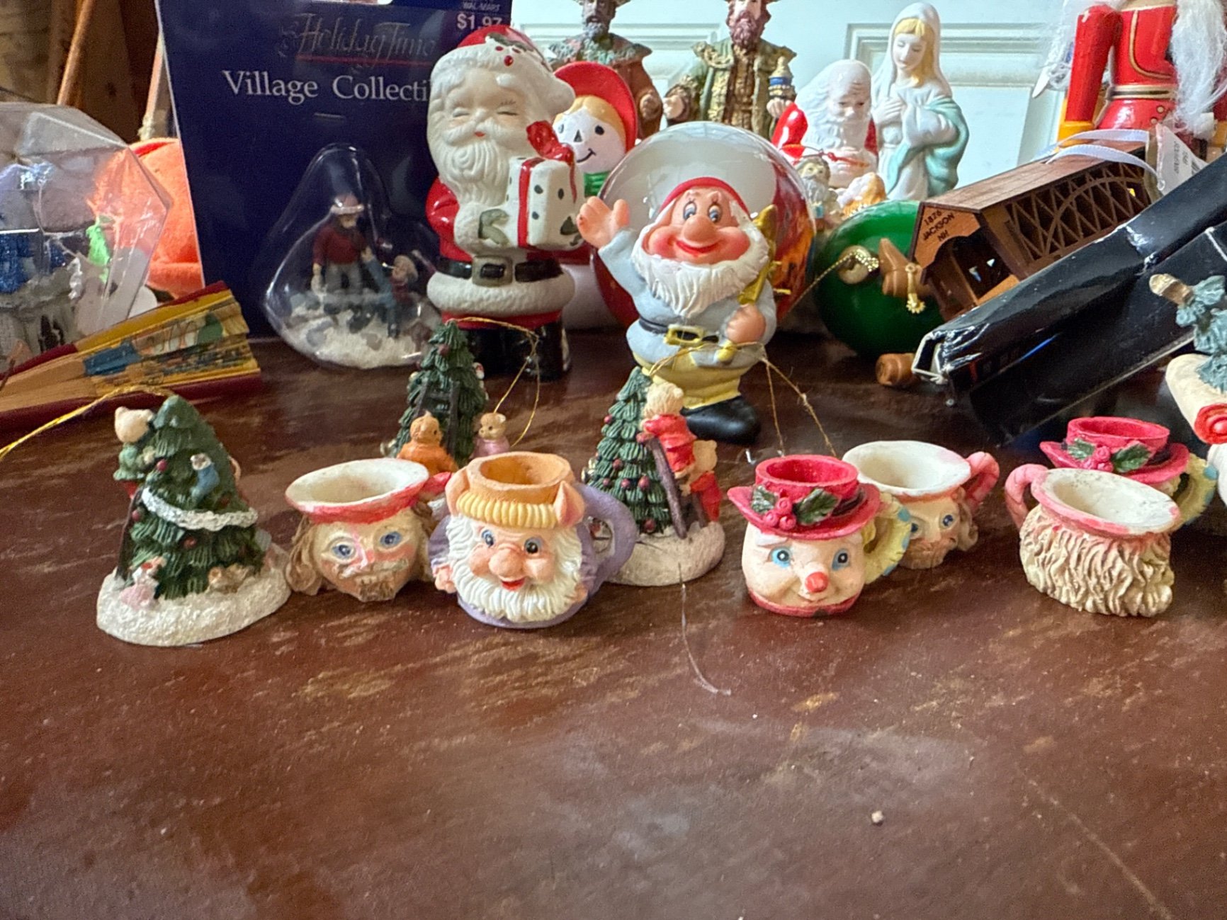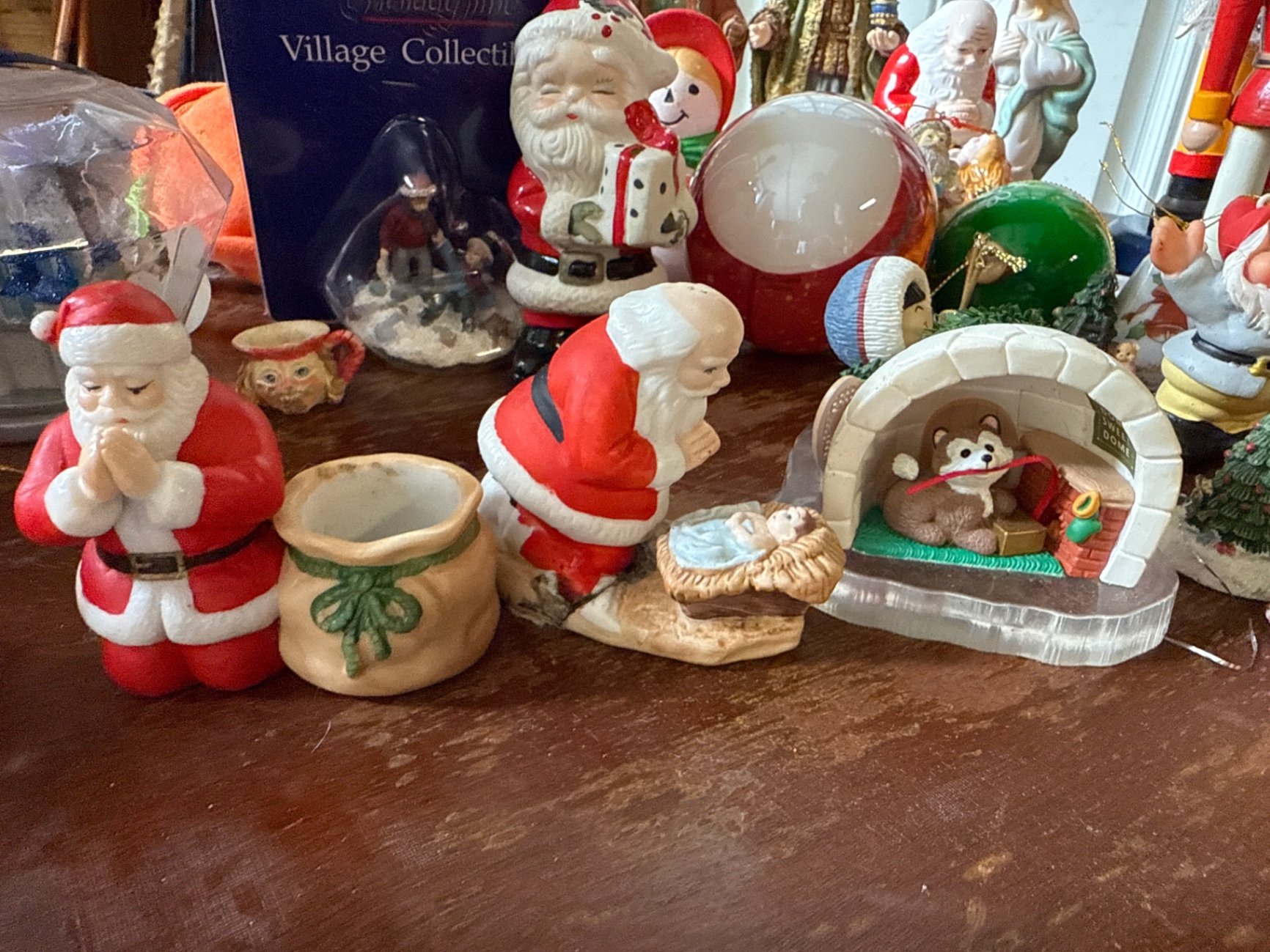 A mixed assortment of Christmas-themed decorations including Santa and elf figurines, Disney, nutcrackers, Lefton nativity pieces, hanging ornaments, snow globes, and rolls of gift wrap and decorative paper. Located in garage.