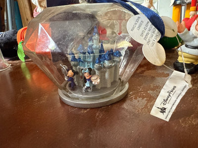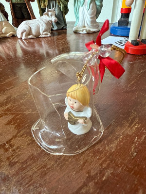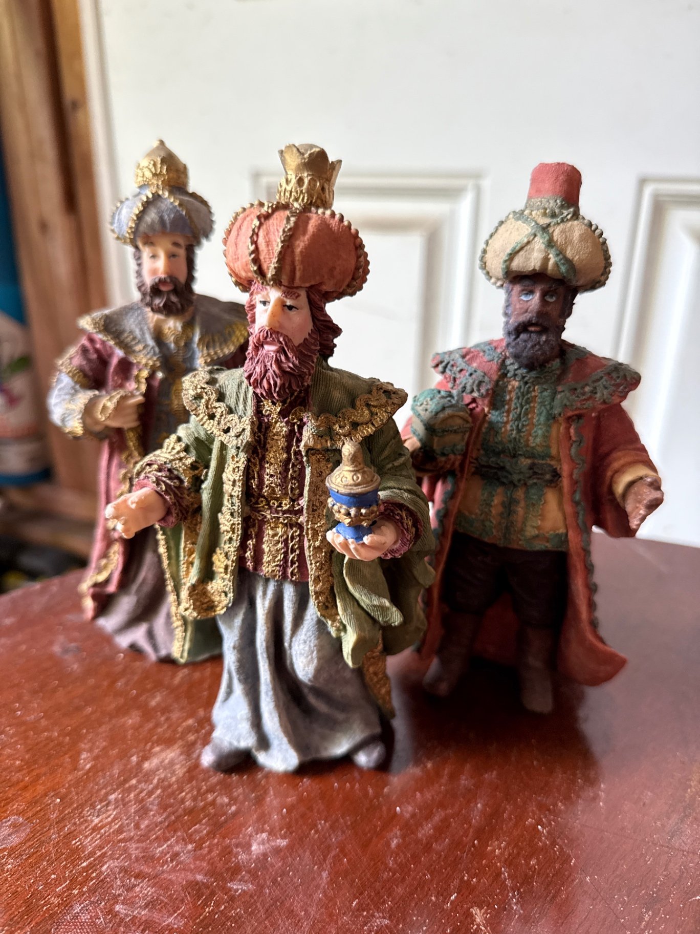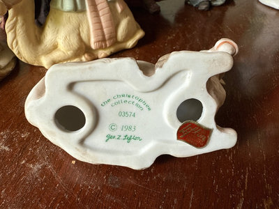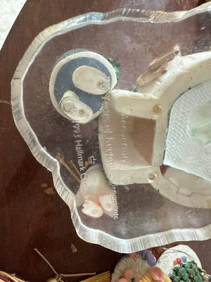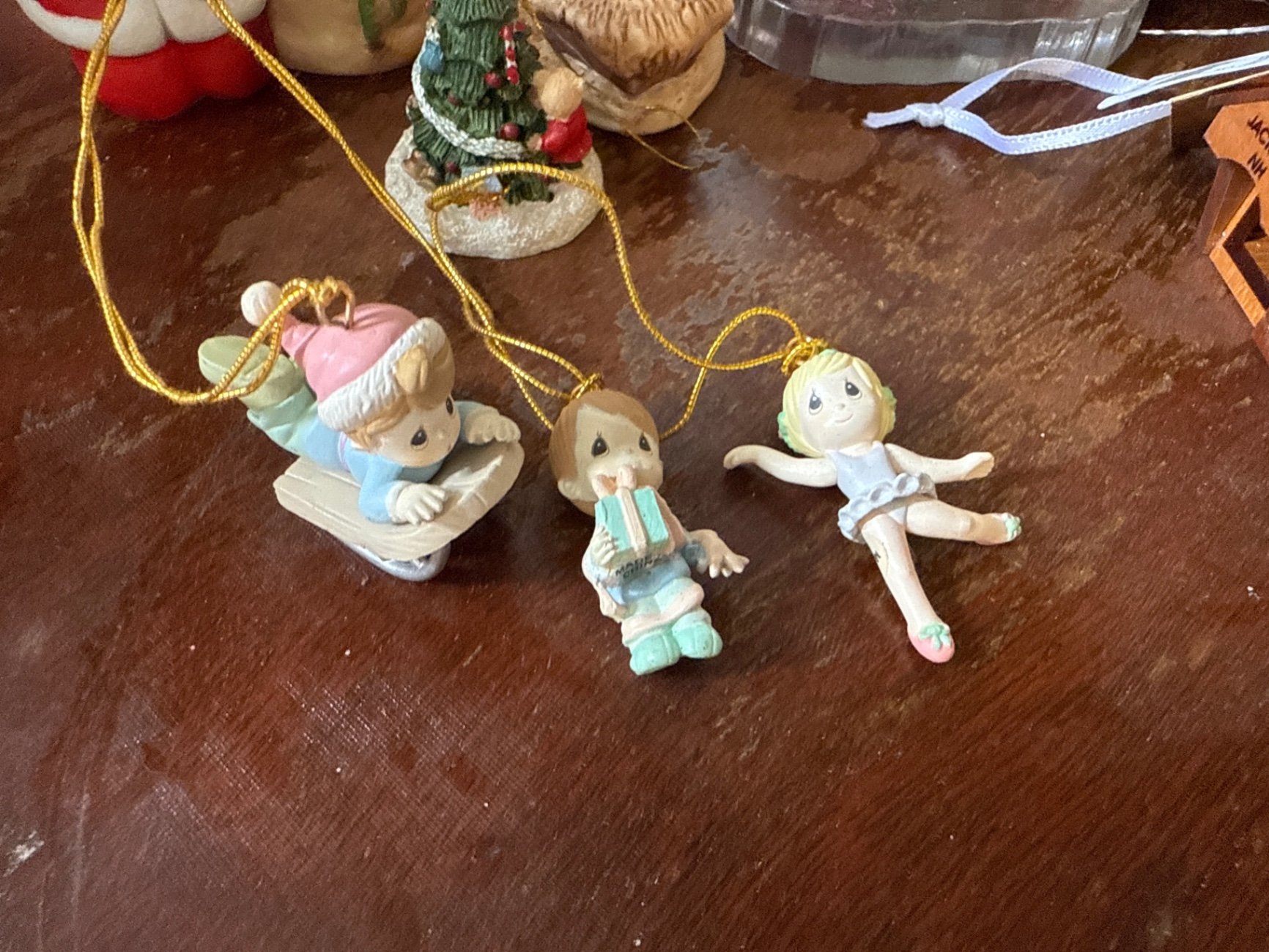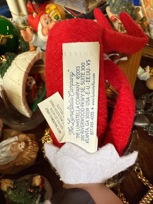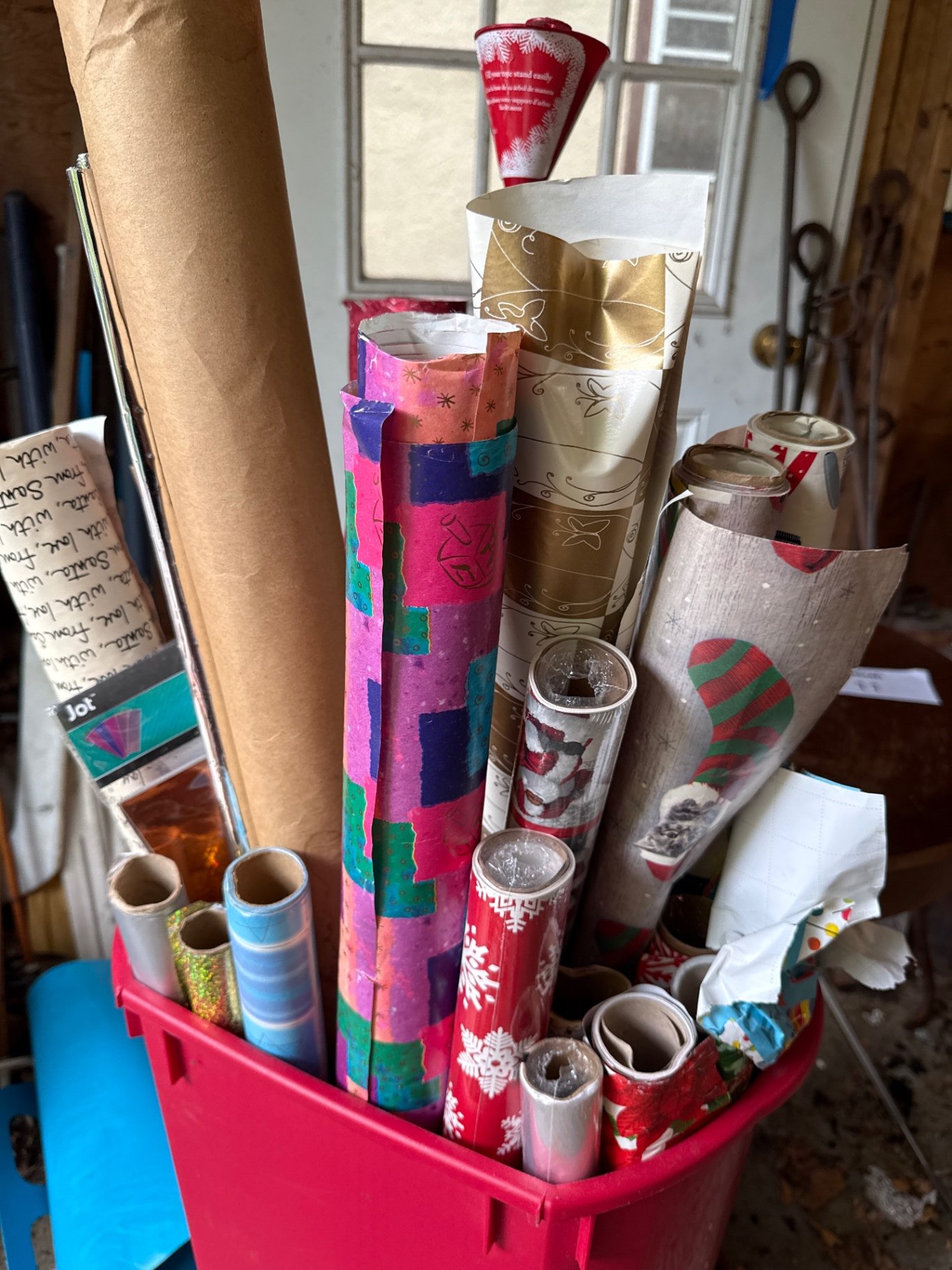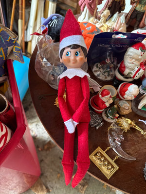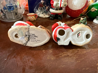 A mixed assortment of Christmas-themed decorations including Santa and elf figurines, Disney, nutcrackers, Lefton nativity pieces, hanging ornaments, snow globes, and rolls of gift wrap and decorative paper. Located in garage.