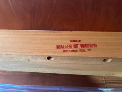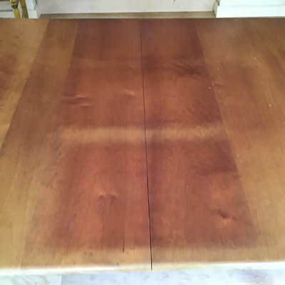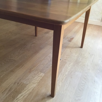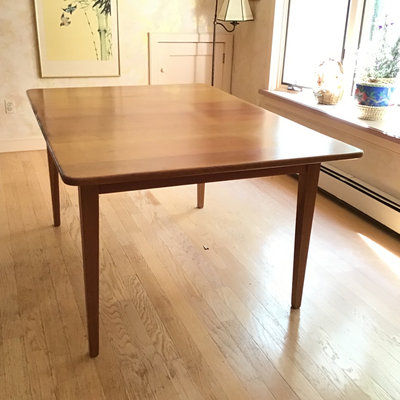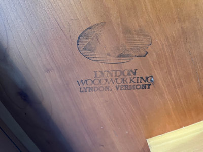 Vintage wood extension dining table with rounded corners, measures 60x42x30, has fading on top from being in sunny room.Includes one 18in leaf. Stamps for Lyndon Woodworking, Lyndon Vermont and Walter of Wabash, Jamestown Tennessee stamped on bottom. Legs detached for travel. Heavy, bring help and appropriate vehicle to pickup. 1 piece.