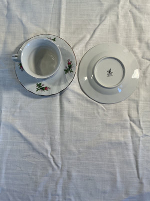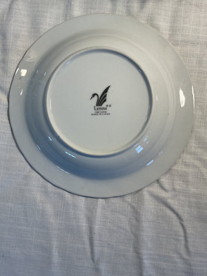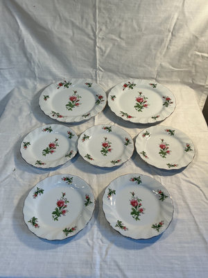 A white porcelain partial set with pink rose bouquets and green leaves, including a large oval platter, serving bowl, two dinner plates, five salad plates, two bowls, and a teacup with two matching saucers, one with a chip. All pieces feature a floral pattern with a dark rim, and the underside is marked 'Lynns Fine China Made in China Victorian Rose'.
