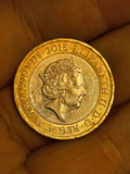 A UK two-pound commemorative coin featuring Magna Carta on the reverse and a portrait of Queen Elizabeth II on the obverse.