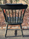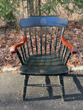 Vintage Windsor- style chair with black lacquer, cherry stained arms gold pinstriping, laser-engraved crest on the backrest and saddle seat.