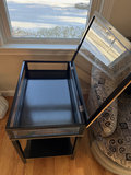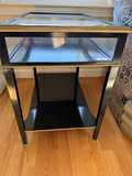 Glass-topped end table with a black metal frame, brass-tone trim, and a lower shelf. 15x24x22