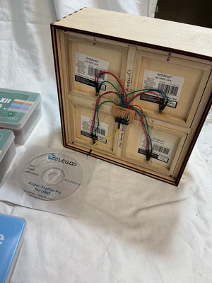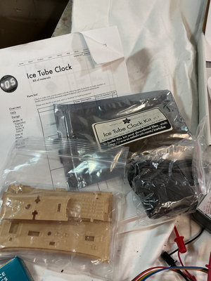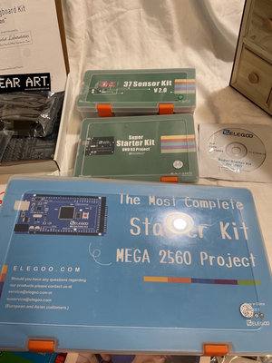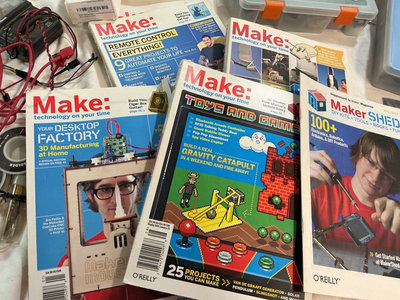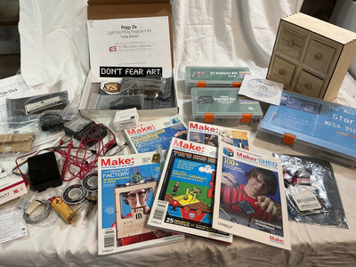 A collection of DIY electronics and maker kits and accessories, including starter kits, sensor kits, an Ice Tube Clock Kit, a pegboard LED/light kit, assorted Make: magazines, cables, and related components. Some of these kids are open, completeness not verified.