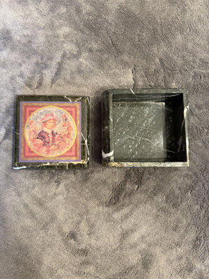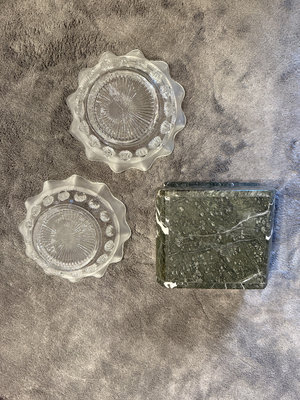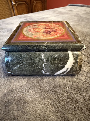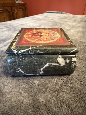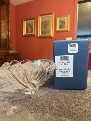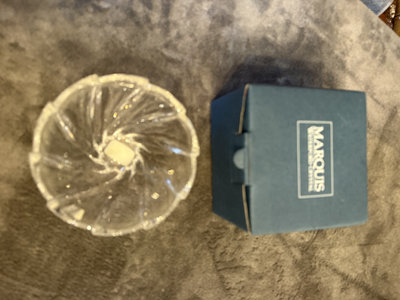 A collection of Marquis Waterford crystal pieces comprising two scalloped-edge glass bowls, a Windflower 6-inch bowl in its box, a swirl-cut crystal bowl, and a green marble decorative box with a colorful circular lid design. The set also includes a Marquis box and informational booklet.