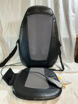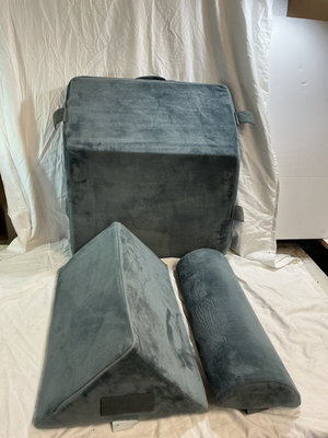 A black massage chair cushion with an attached remote, tested and a large blue-gray cube back support, a rectangular wedge cushion, and a cylindrical blue-gray bolster.