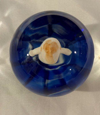 This type of art glass is often referred to as sulphide paperweight with a figure encased in glass . The figure is a Kewpie doll . Stamped on the bottom, is Maude and Bob St. Clair, 1978. The Kewpie doll was a cartoon character created by illustrator Rose O’Neill in the early 20th century.