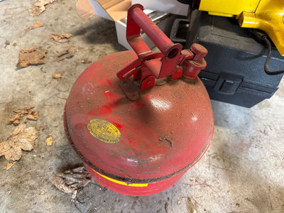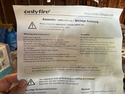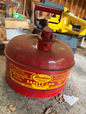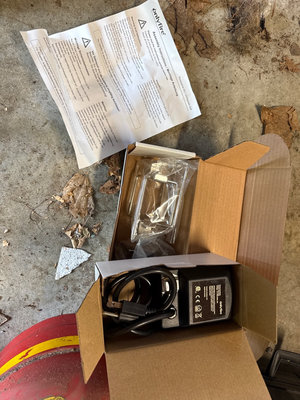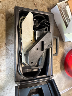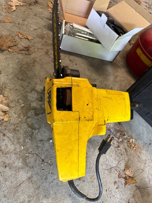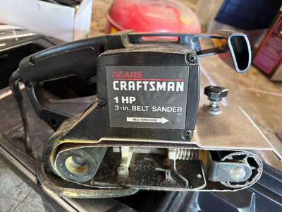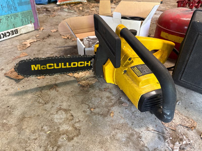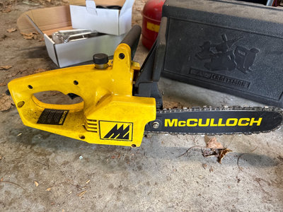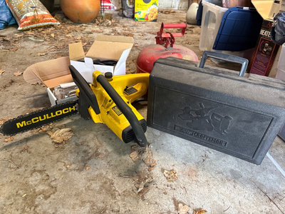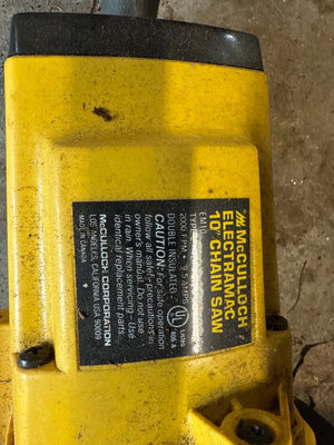 A collection of tools and accessories including a yellow McCulloch electric chainsaw, a Sears Craftsman 1 HP belt sander with case, a red Brookins safety can, a rotisserie motor kit with brackets and hardware, and related instruction sheets and power adapters. Located in garage. Untested.