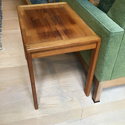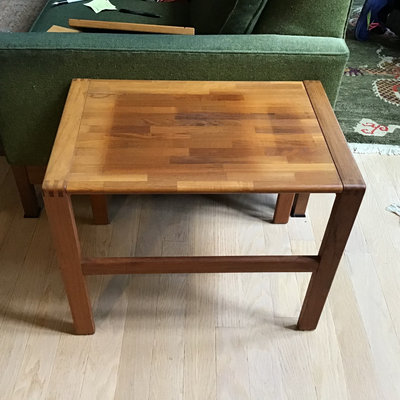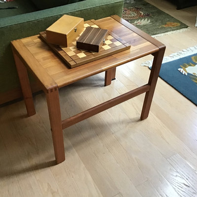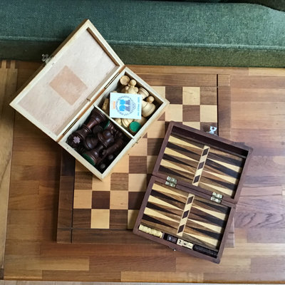 Captain Line side table with fading on top, 23.5x15.5x19. Small backgammon set and felt-based wooden chess piece set with wooden chess board. 4 pieces.