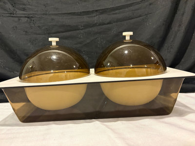 Vintage Neapolitan Flip Coffee Pot, Lincoln Beautyware flour and sugar cannisters, Pyrex mixing bowls, custard and refrigerator dishes, Tupperware Servalier containers and bottle , Everlast aluminum trivets, 2 stainless steel trays made in Denmark, enamelware spoon, straw server container, Atomic buffet domed server .