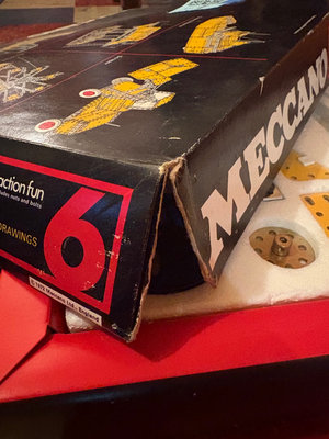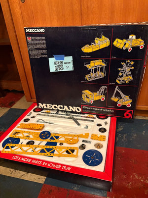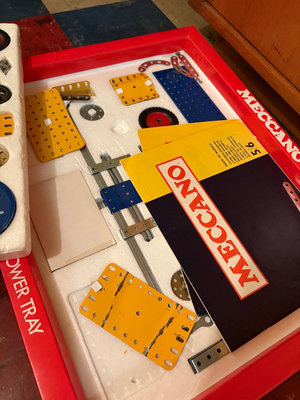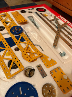 Meccano construction toy set featuring yellow perforated metal strips, blue wheels and gears, metal brackets and plates, nuts and bolts, and an instruction booklet. UNTESTED FOR COMPLETENESS.