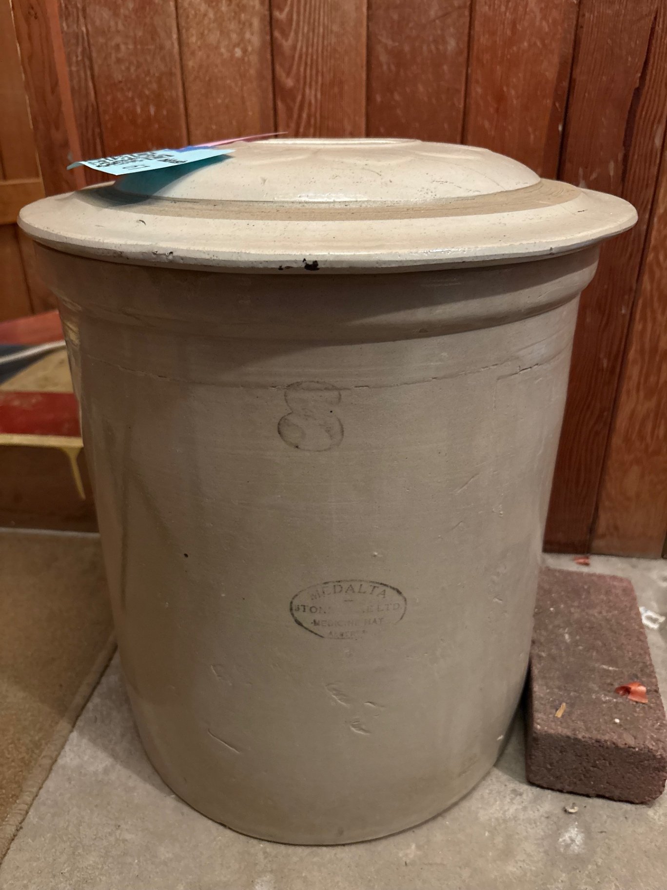 A large light-gray Medalta 8 stoneware crock with a matching lid. Made in Medicine Hat Alberta and measures approximately 14.5 inches wide, 14.5 inches deep, and 16.5 inches high. Hairline crack in lid. **HEAVY, BRING HELP TO MOVE OUT OF BASEMENT.