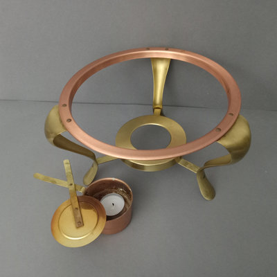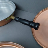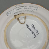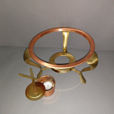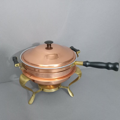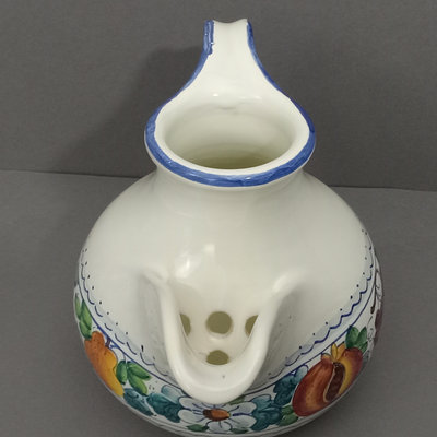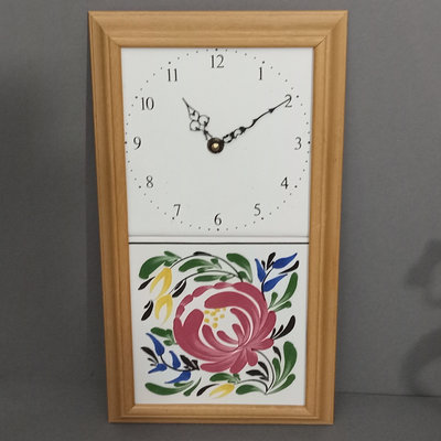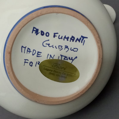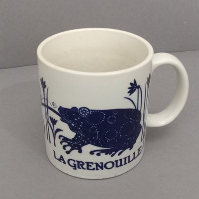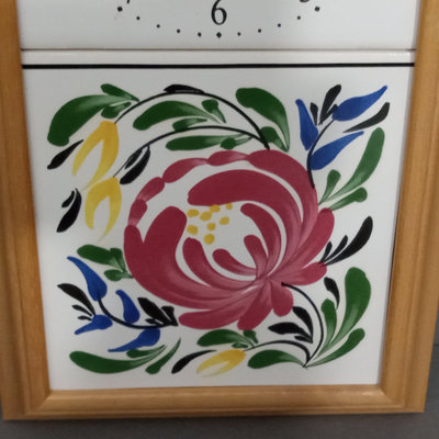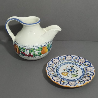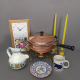 Channel your inner Julia Child! Wood framed tile wall clock, case made in England, clock made in Germany, battery-op untested, 14x7.5. Copper and brass chafing dish, lid slightly ill-fitting, 9.5d x 10h. Hand painted sangria pitcher by Aldo Fumanti, made in Italy, 6.5h. Olive plate, made in Spain, 6.5d. MCM Frog mug, well loved, made in Japan, 4h. 7 pieces.
