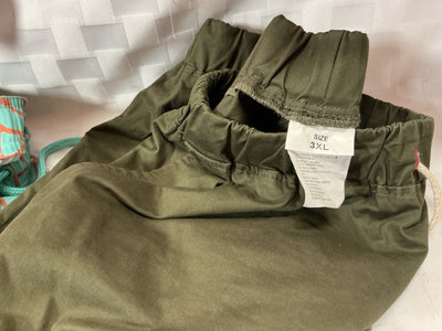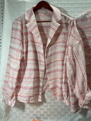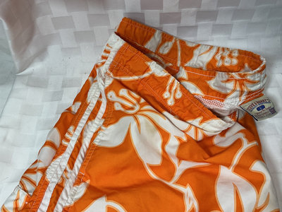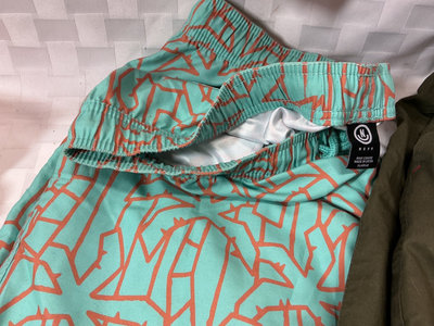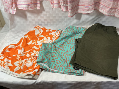 Two pink striped lightweight shirts and three pairs of shorts with orange floral, teal geometric, and solid olive green patterns.