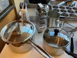 Includes a Cuisinart large pot and a Farberware medium pot, splatter roasting pans, and all kinds of baking pans, graters, sifter, and more%