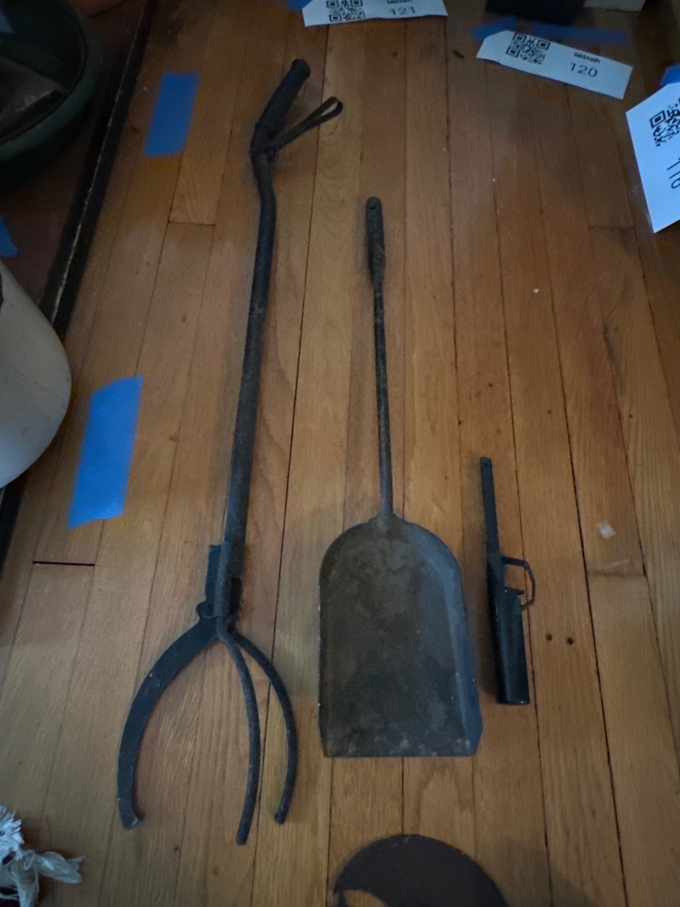 Fireplace tools including a shovel blade on a long handle, a curved-tine fork. Crescent-moon metal yard stake featuring star cutouts.