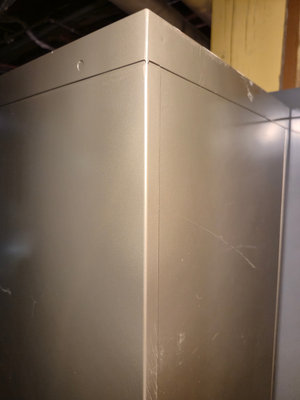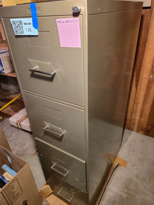 A tall gray metal filing cabinet with four drawers and metal handles. The top drawer is partially open, revealing the interior and rails. It can close with no problem, the cabinet surface has scratches and scuffs. ** BRING HELP TO MOVE OUT OF BASEMENT