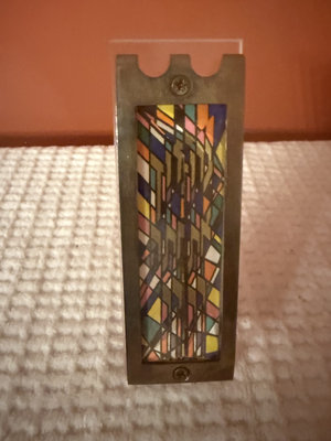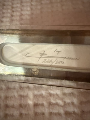 A vertical metal-framed wall panel with a colorful geometric mosaic inset, a clear acrylic display piece, and two labels including a signed edition number (e.g., 226/250) and a machine-readable code label.