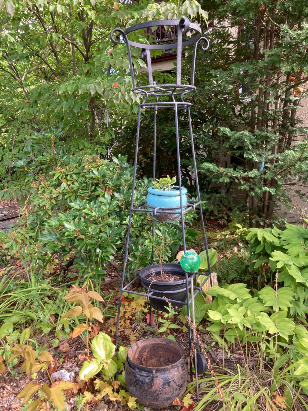 A tall black metal plant stand with three circular shelves holding various pots, including a blue ceramic pot with a succulent, a black pot, and a heavy, metal container, along with a green glass decorative orb.
